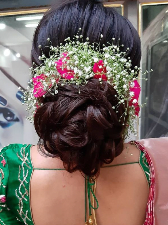 Classic bun with loose curls and flower application